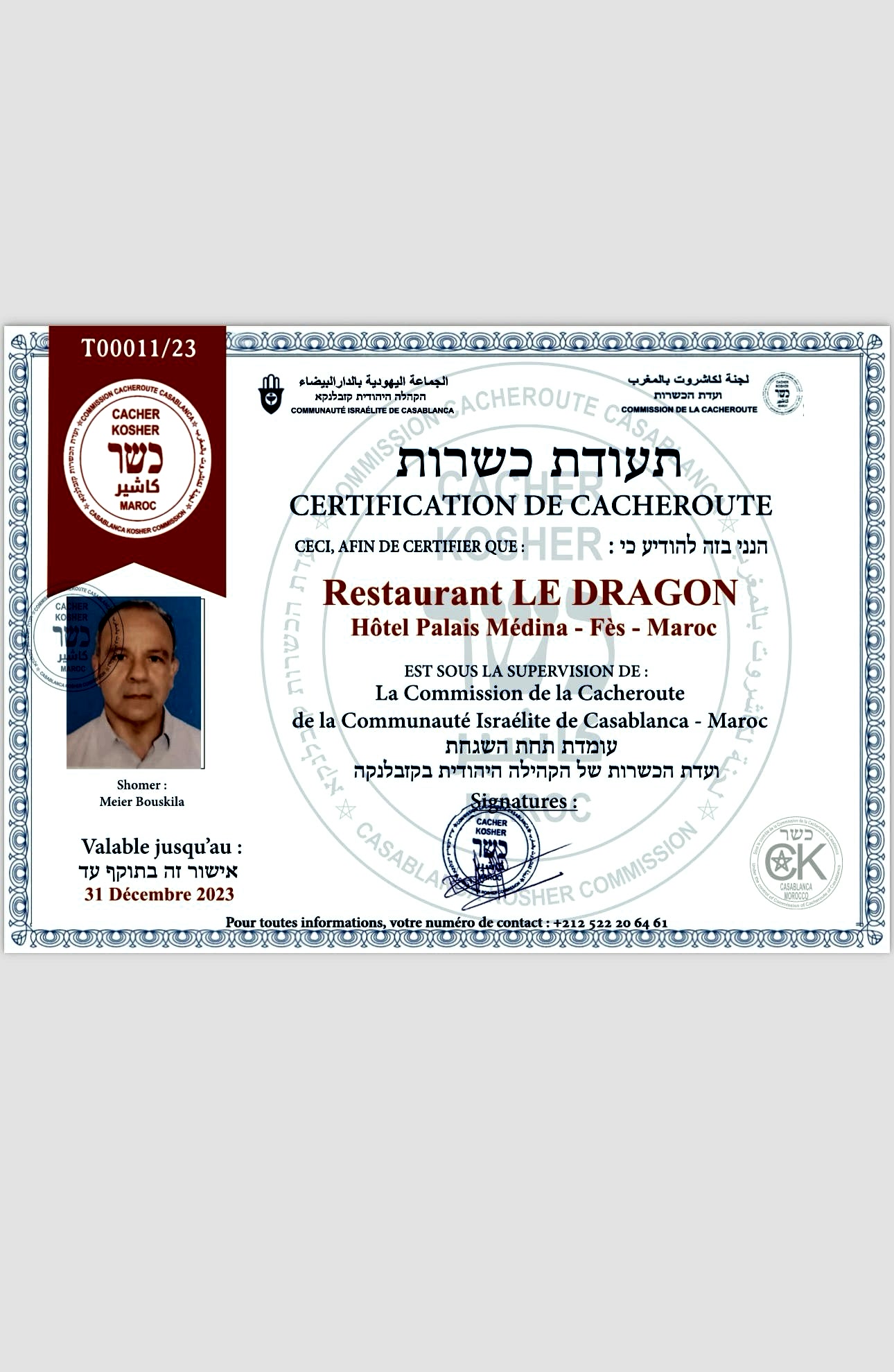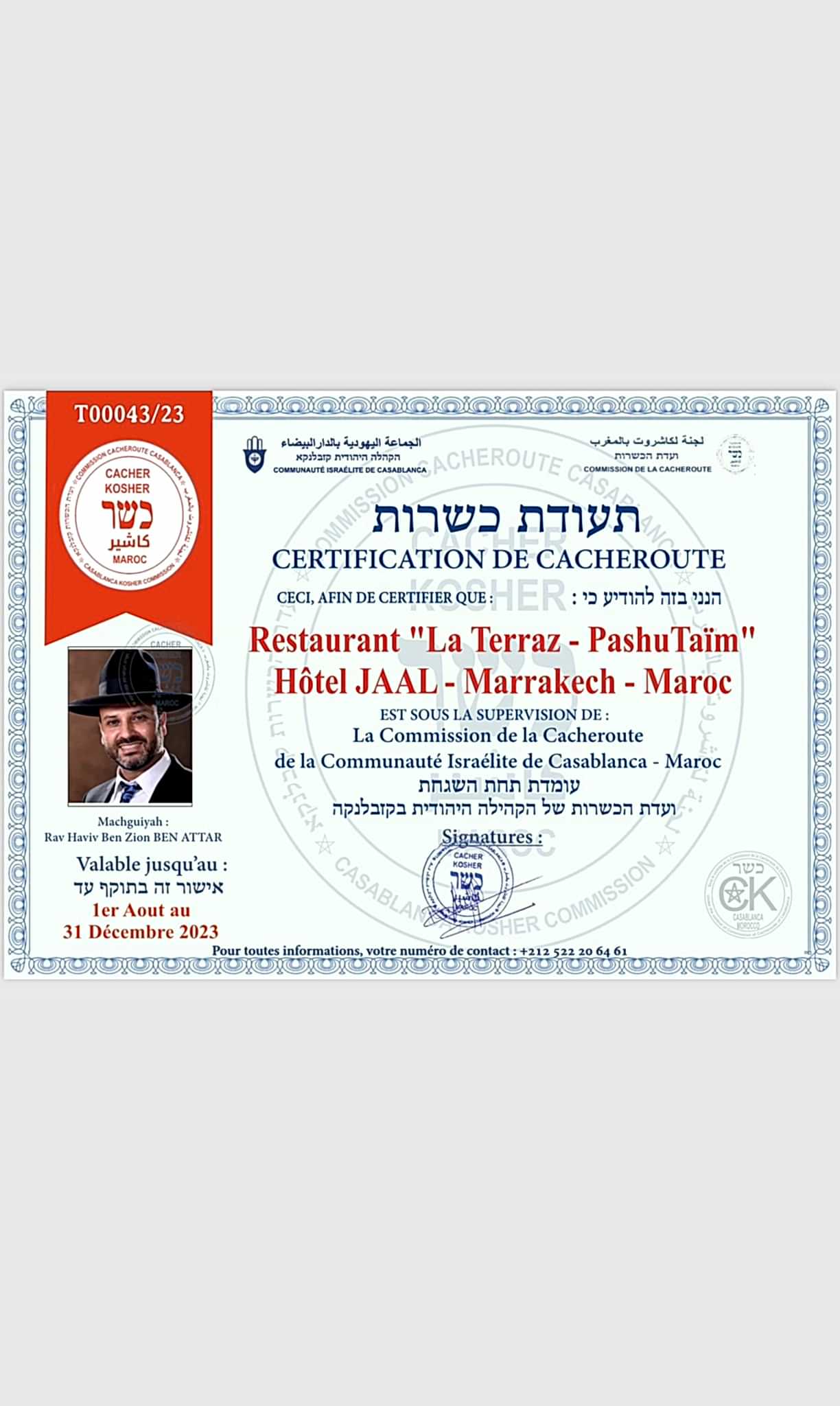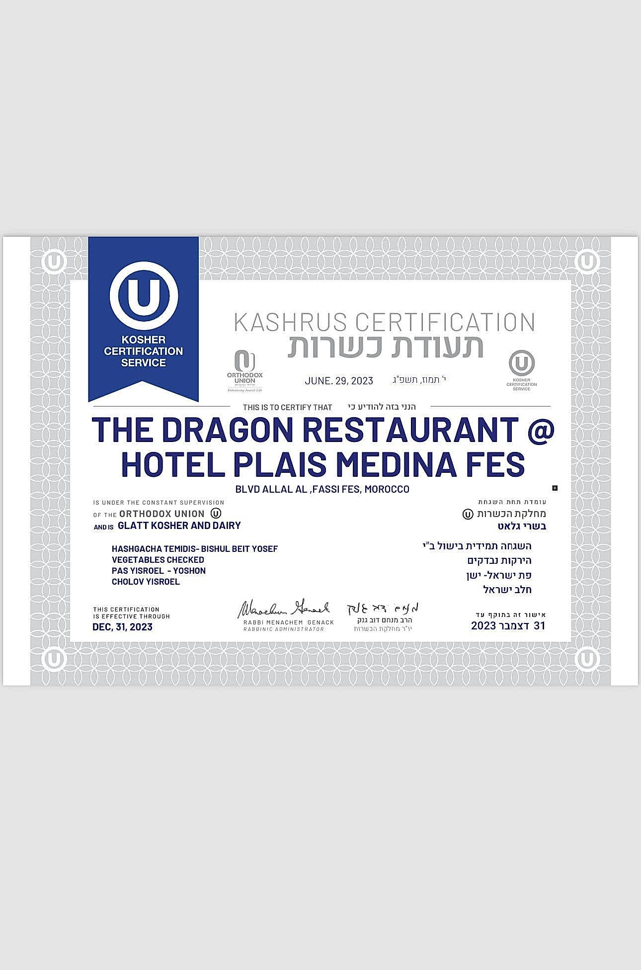 SARAH TOURS stands out in Morocco as the only company that offers Glatt Kosher restaurants, catering services, events, and agri-food productions. • GLATT KOSHER- BEIT YOSEF • BISHUL BEIT YOSEF • PAS YISROEL • CHOLOV YISROEL • VEGETABLES CHECKED • YOSHON • HASHGACHA TEMIDIS