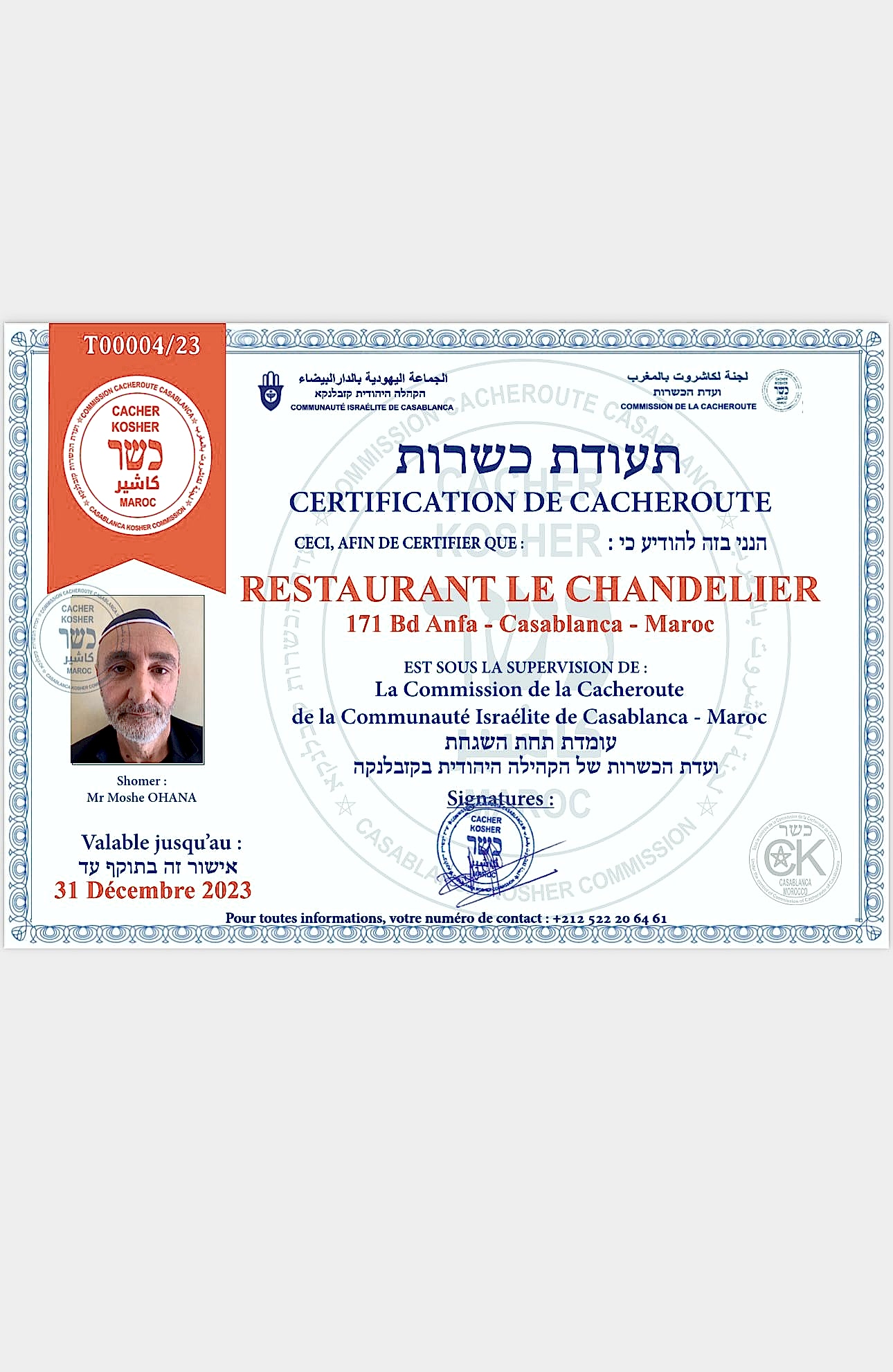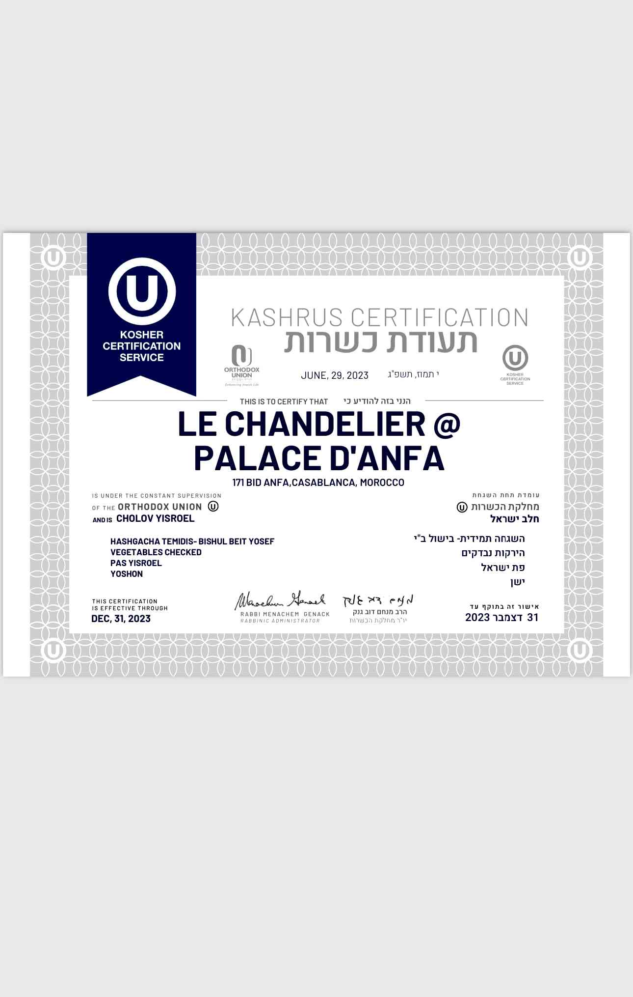 Discover an exceptional culinary experience at the heart of our three Glatt Lamehadrin kosher restaurants (under the supervision of : Orthodox Union USA and the Kashrut Commission of Casablanca), the only ones in Morocco.